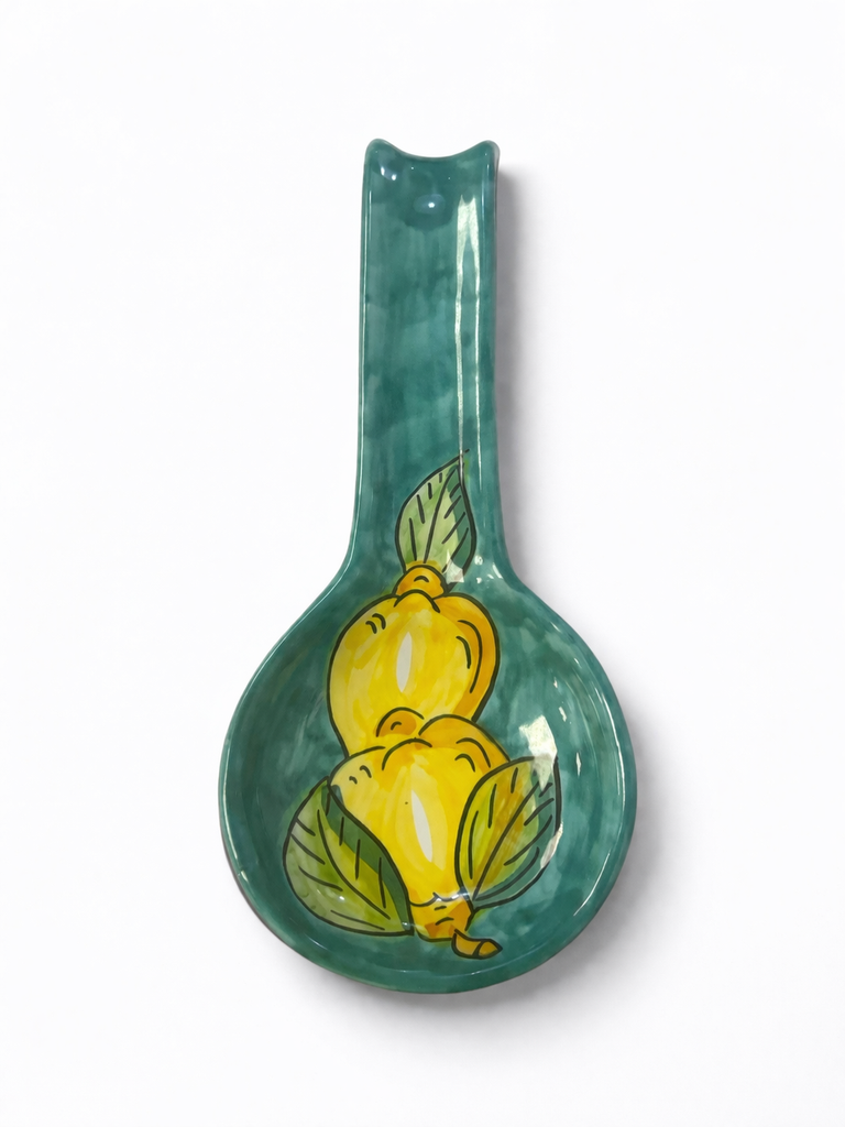 Bring a touch of Southern Italy into your kitchen with this beautifully hand-painted ceramic spoon rest. Featuring vibrant yellow lemons and green leaves over a rich turchese (teal) glaze, this piece is both functional and decorative.