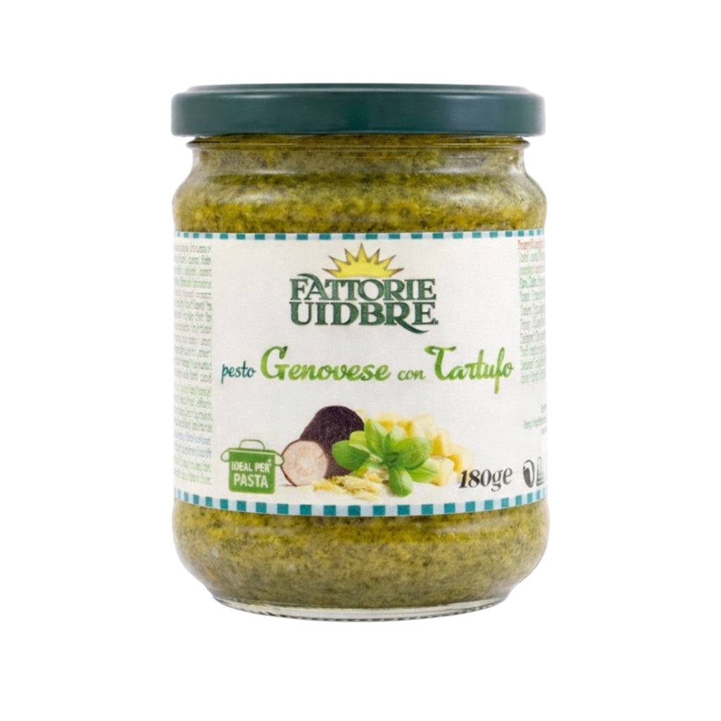 Fattorie Umbre Basil Pesto Premium Quality with Truffle Glass jar 180g Using a Premium Basil Pesto as a base, a surprising variation to the theme is created by adding black truffle. The freshness of the basil fused with truffle aroma creates a new, unexpected flavour. Try it to believe...