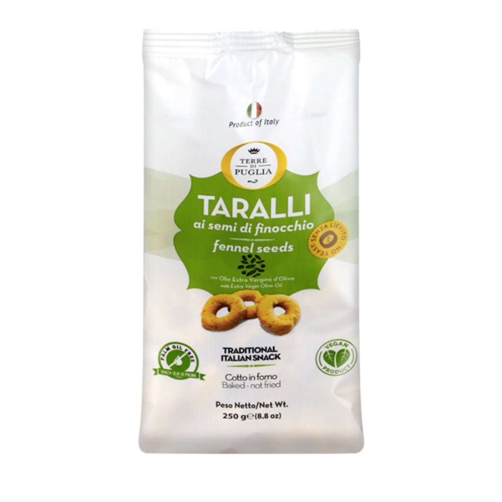 TERRE DI PUGLIA FENNEL SEEDS TARALLI 250g With an aromatic flavour, taralli with fennel seeds and extra virgin olive oil are a classic recipe from the Apulian tradition. Baked in the oven and fragrant on the palate. Fennel seeds taralli are excellent to nibble during snacks, ideal for appetizers...